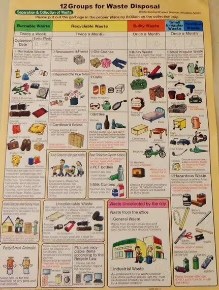 Στην Ιαπωνία η απόρριψη των σκουπιδιών και η ανακύκλωση των υλικών έχει γίνει επιστήμη. Όλα τα σκουπίδια και τα άχρηστα υλικά που προορίζονται για ανακύκλωση χωρίζονται σε πολλές κατηγορίες και απορρίπτονται συγκεκριμένες ημέρες της εβδομάδας. Θεωρείται προσωπική ευθύνη του κάθε πολίτη να διαχωρίσει και να απορρίψει σωστά τα σκουπίδια του, συνήθως σε μικρούς, ειδικά διαμορφωμένους χώρους μπροστά από το σπίτι. Δεν υπάρχουν μεγάλοι κάδοι όπως στην Ελλάδα, δεν υπάρχουν γενικά κάδοι πουθενά στους δρόμους, ούτε πετάει ο καθένας οτιδήποτε όποτε «του καπνίσει». Αν κάποιος φεύγοντας από το σπίτι βγάλει σκουπίδια διαφορετικής κατηγορίας από εκείνη που έχει οριστεί για αποκομιδή τη συγκεκριμένη μέρα, πολύ απλά θα τα βρει να τον περιμένουν στην πόρτα του όταν γυρίσει!
